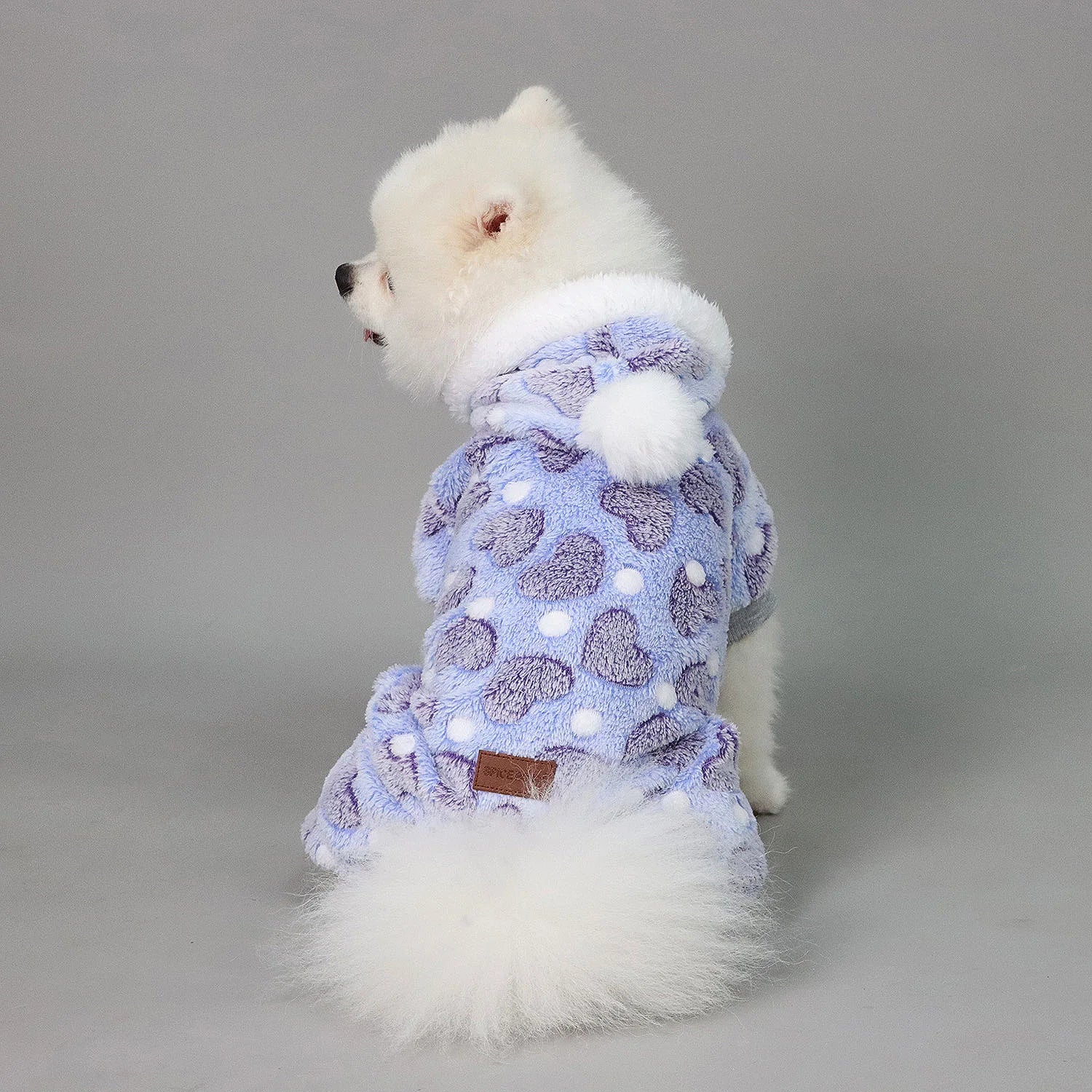 Plush Dog Pajamas – Warm Heart Print Fleece Onesie with Pompom for Small Dogs