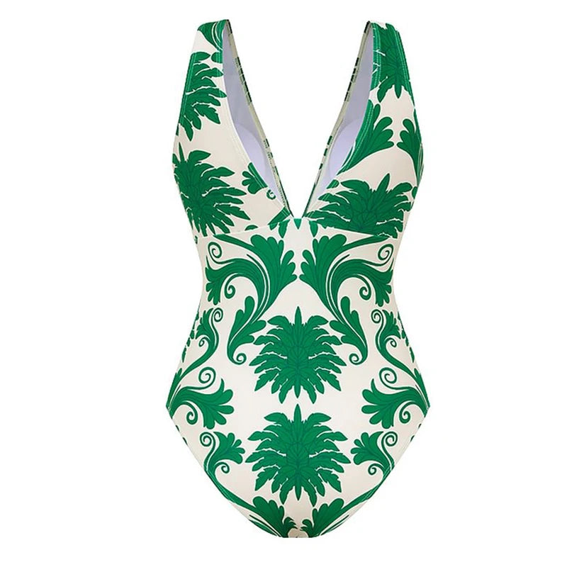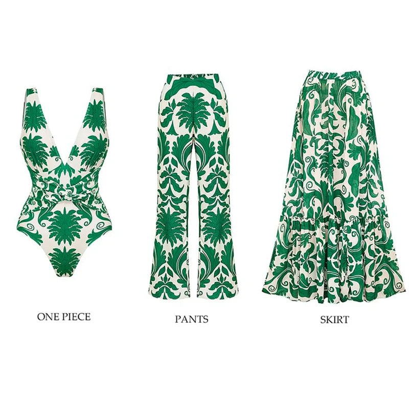 Features a sexy deep V-neck one-piece monokini that sculpts and flatters your figure, paired with matching flowy printed beach pants for a coordinated luxury look.