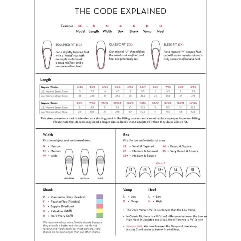 The Gaynor Minden Sculpted Fit Pointe Shoes are designed for dancers with a slightly tapered foot with a "waist", and are made with an ample metatarsal, a snug midfoot, and a narrow-medium heel.