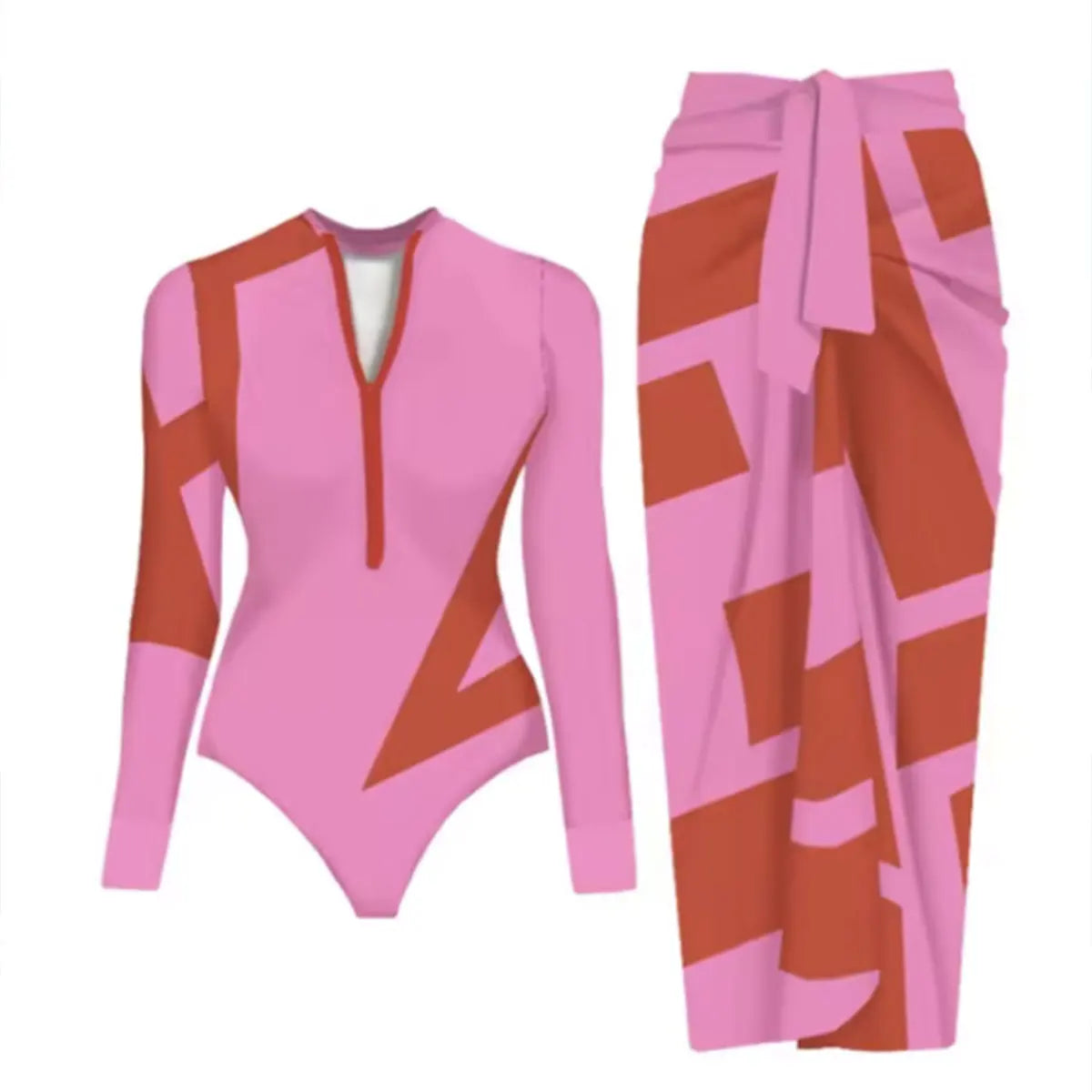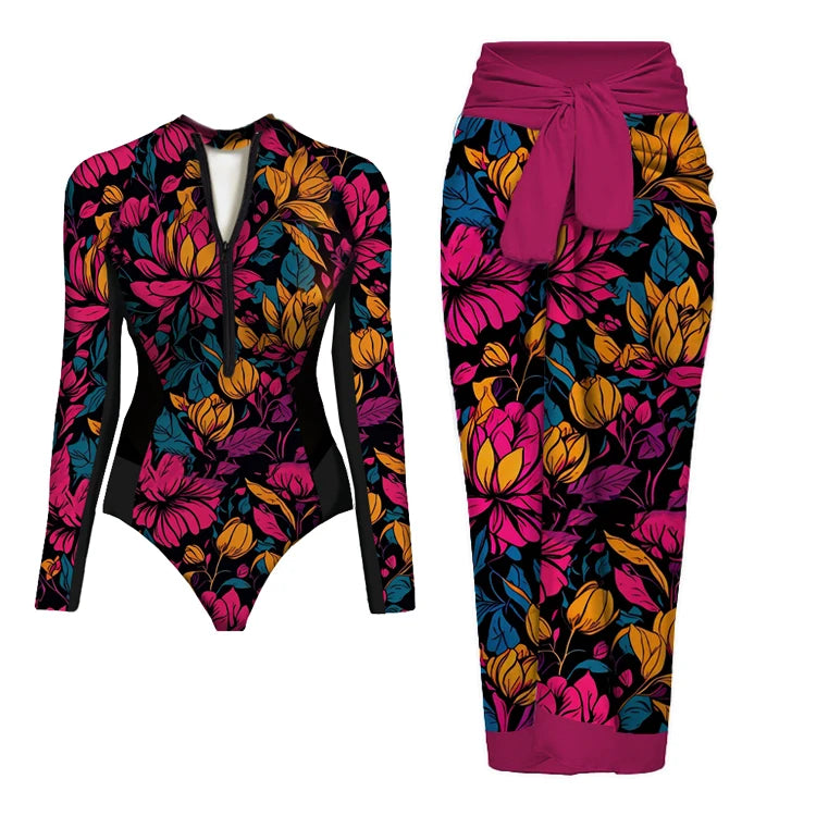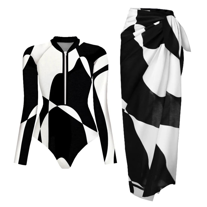 This two-piece surf set features a one-piece zipper swimsuit and a matching wrap skirt, blending sporty comfort with timeless beauty.