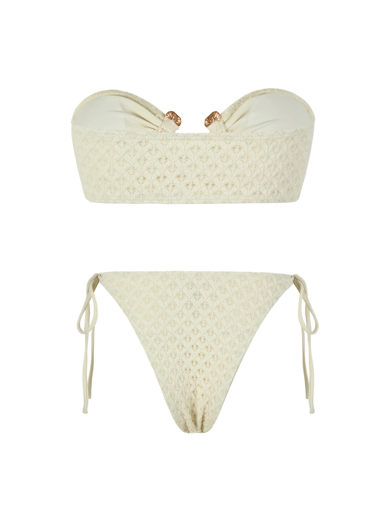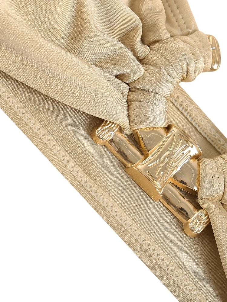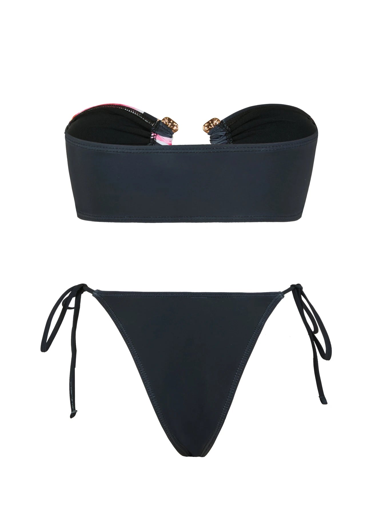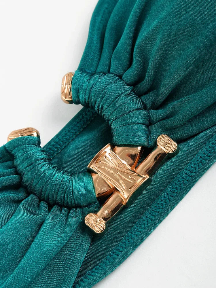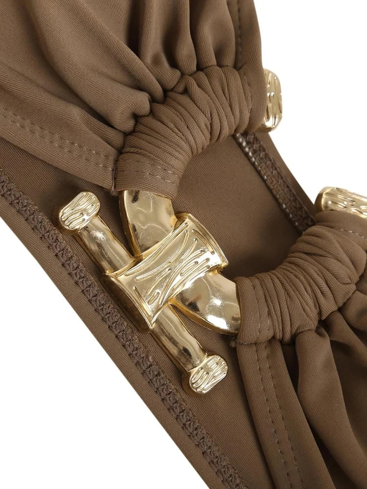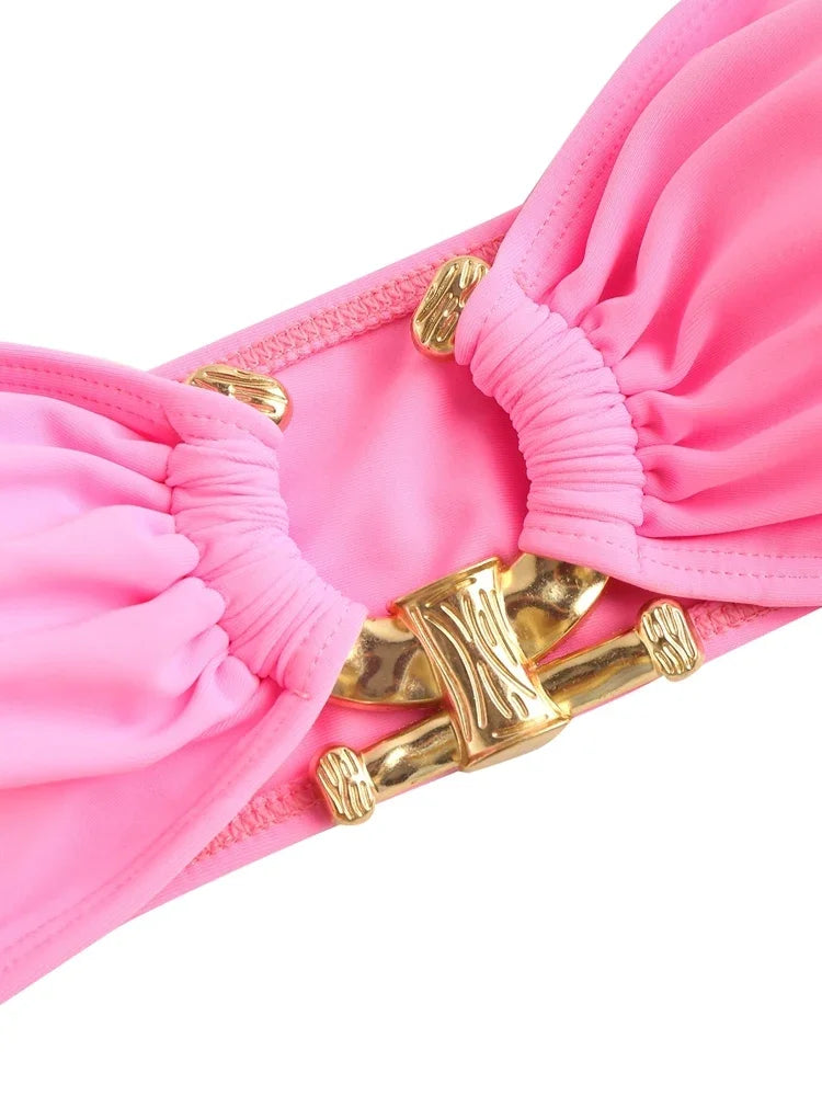 Features a padded bandeau bra top with metal ring hardware accents that add a sleek, luxurious touch.