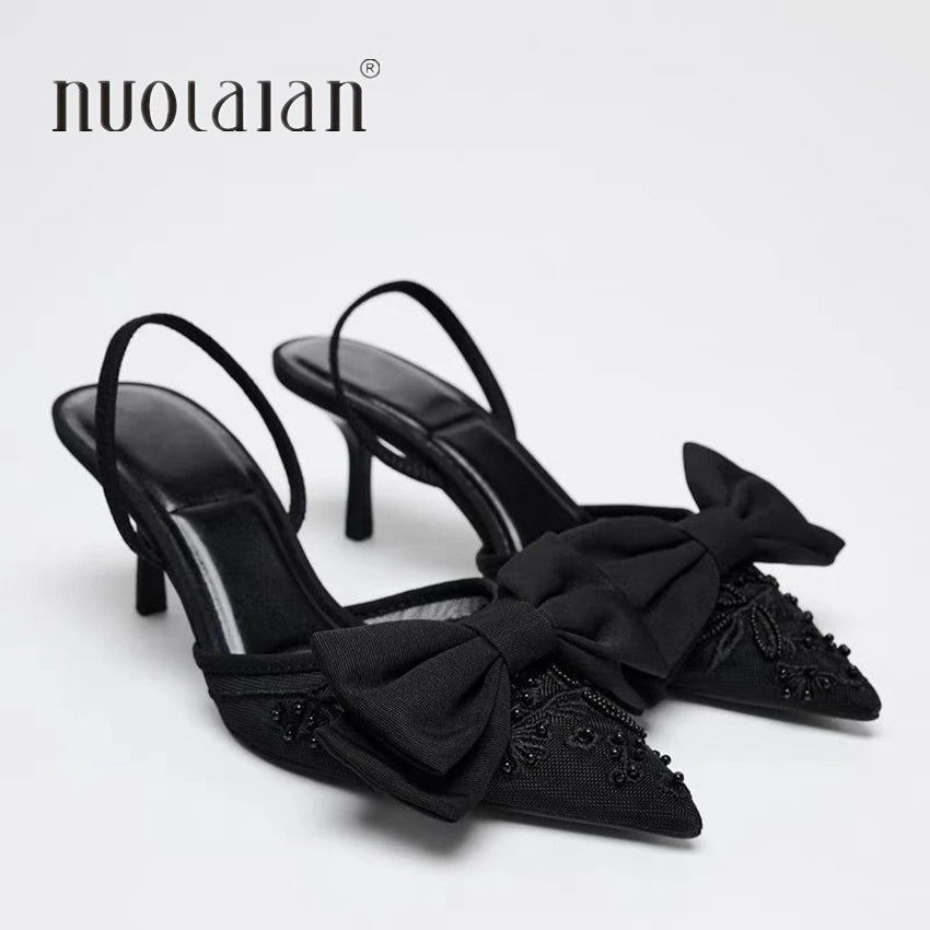 Black Bow knot High Heels Sandals Women 2025 Summer Slingback Pumps Vintage Satin Pointed Toe Heeled Elegant Party Lady Shoes