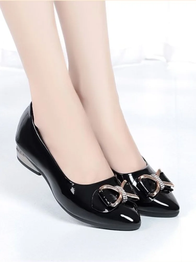 Women Fashion Light Weight Black Bow Tie Pu Leather Slip on Square Heel Shoes for Party Lady Casual Comfort Office Shoes A15